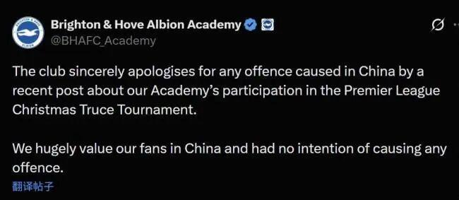 "The club sincerely apologises for any offence caused in China by a recent post about our academy's participation in the Premier League Christmas Truce Tournament," the club's academy said in a post on X.
